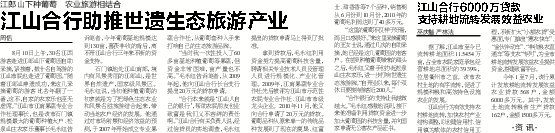江山合行为有效支持农村耕地流转,加快农村产业结构调整,以创建信用村、信用镇为载体的农村信用工程,不断扩大“小额农贷”受惠面,专门推出“惠农快车”、“金伙伴动车”、“丰收粮农直通车”等支农“专列”,为全市耕地流转发展效益农业提供资金,搭建致富平台。