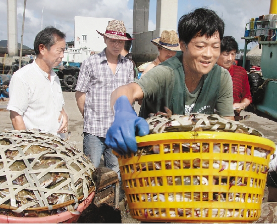 “我现在装来的全是活蟹,有3万斤。”8月28日下午,舟山国际水产城活鲜码头,又一艘渔船拢洋,船老大高兴地对笔者说,“这几天从东海捕捞上来的梭子蟹已经大量上市,现在正是吃梭子蟹的时候,只卖20元一斤,便宜。” 本报通讯员 翁盈昌 摄 |