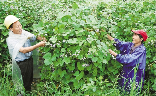 8月28日,建德市寿昌镇山峰村果蔬种植大户徐海清夫妇穿着雨衣在田间忙着采扁豆。徐海清今年在租赁的10多亩田里轮流种植四季不同的瓜果蔬菜,亩产值可达2万多元。 宁文武 摄