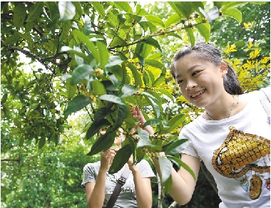 8月28日,在杭州市儿童公园里,几名中学生正在桂花树下观赏绽放的花朵。沁人心脾的桂花香给游人提前带来秋天好心情! 本报记者 杨晓轩 摄