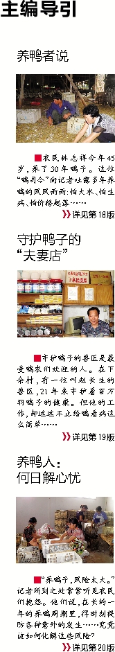 ■“养鸭子,风险太大。”记者所到之处常常听见农民们抱怨。他们说,在长约一年的养鸭周期里,得时刻提防各种意外的发生……究竟该如何化解这些风险?