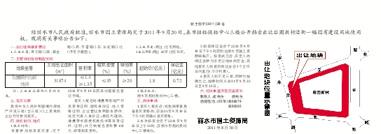 经丽水市人民政府批准,丽水市国土资源局定于2011年9月20日,在市招标投标中心三楼公开拍卖出让后圃新村沿街一幅国有建设用地使用权。现将有关事项公告如下: