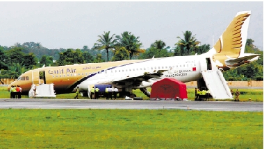 据印度报业托拉斯29日报道,当天凌晨一架巴林海湾航空客机在印度南部城市科钦降落时滑出跑道,不少乘客在恐慌中匆忙跳出机舱,导致7人受伤,其中2人伤势严重。图为滑出跑道的客机。 新华社发