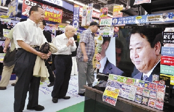 8月29日,在日本东京的一家电器商店,人们观看民主党众参两院议员总会(党首选举大会)选举党代表的新闻。 新华社发