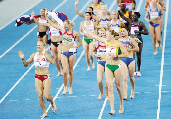 8月30日,俄罗斯选手切尔诺娃(第二排左)与其他选手在女子七项全能800米比赛后赤脚绕场向观众致谢。当日,在2011大邱世界田径锦标赛女子七项全能比赛中,切尔诺娃以6880分的成绩获得冠军。 新华社发