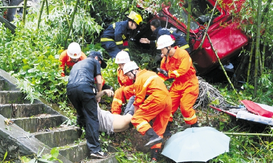 8月29日下午,新昌县城南乡下洋村附近,一辆货车从高速公路翻下路基,消防官兵奋力抢救伤员。 裘红霞 吴平 傅元璋 摄