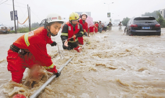 8月30日,安吉县遭遇短时局地强降雨,洪水四溢,县消防大队队员涉水前行,搜寻被困者。 夏鹏飞 摄