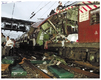 印度西部城市孟买发生爆炸事件后,工作人员从被炸毁的车厢旁走过。