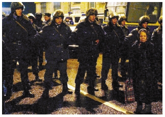 在莫斯科市东南部的轴承厂文化宫外,一名老妇人(右前)焦急地等待遭到劫持的亲人的消息。