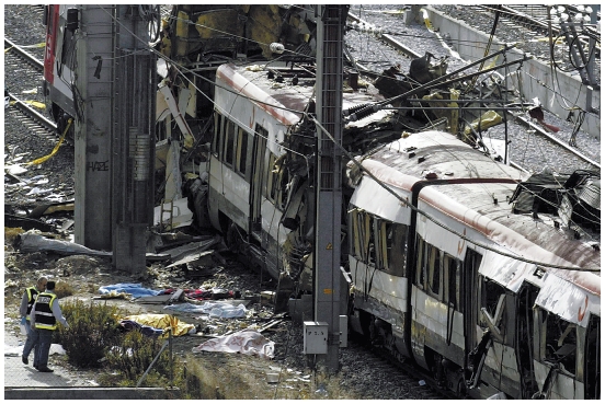 西班牙警察在马德里阿托查火车站察看爆炸现场。