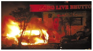 在巴基斯坦南部港口城市卡拉奇,一辆汽车在爆炸发生后燃起大火。