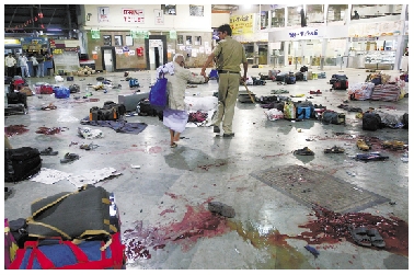 一名警察在印度孟买发生枪击事件的火车站帮助一名老人撤离。