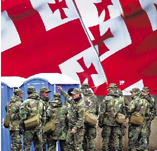 | 2003年年底,在格鲁吉亚,反对党领袖萨卡什维利领导“玫瑰革命”,把总统谢瓦尔德纳泽赶下了台。但“玫瑰革命”后的经济衰退、通货巨幅膨胀使人民生活更糟,最后,民众用萨卡什维利当年的方式——示威游行呼吁他下台。图为2007年11月8日,防备民众动乱的警察在格鲁吉亚首都第比利斯的议会大楼附近警戒。 新华社发 |