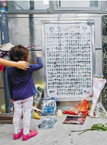2011年9月5日,在美国纽约世贸中心遗址旁,一个孩子参观缅怀“9·11”恐怖袭击中牺牲的消防员的纪念碑。 新华社发