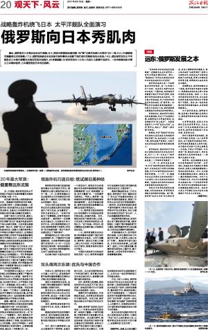 最近,俄罗斯在日本附近地区动作频频:8日,两架可搭载核武器的图-95“熊”式轰炸机绕日本领空飞行一周;9日,24艘俄海军舰艇穿过宗谷海峡;11日,俄罗斯国家安全会议秘书帕特鲁舍夫视察了国后岛和齿舞群岛的水晶岛;14日,俄东部军区和太平洋舰队在日本海和鄂霍次克海的军演全面铺开,50多艘舰艇、50多架军机和1万名士兵进行大规模作战演习。一连串密集的组合拳让日本媒体惊呼,日本遭受到前所未有的挑衅。