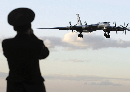 在俄罗斯恩格斯军事基地,一名俄国军官给一架图-95战略轰炸机拍照。该军事基地是多架俄军轰炸机的驻在地(资料照片)。 新华社发