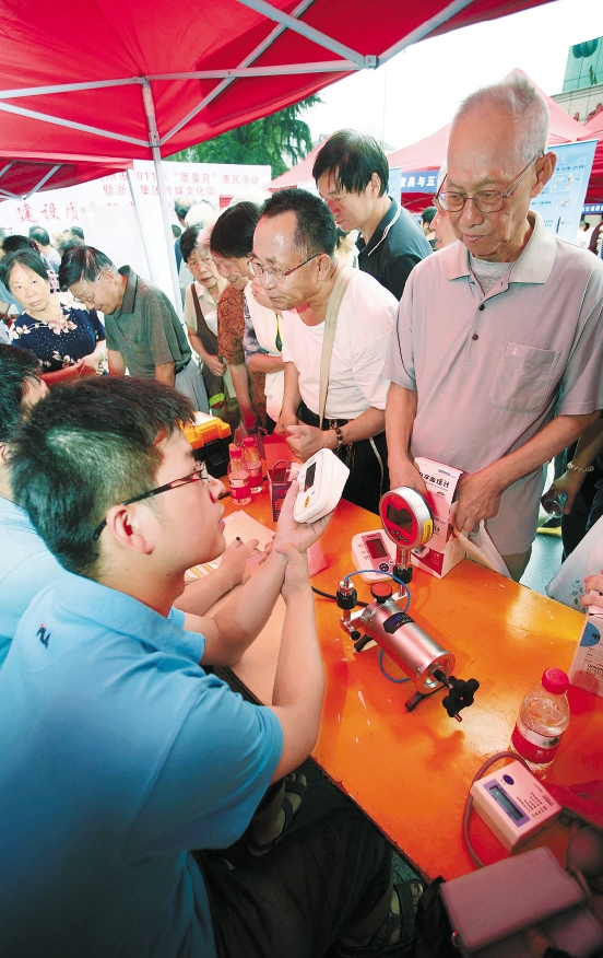 图为质监工作人员正在帮社区居民检测血压计。 梁臻 魏志阳 摄