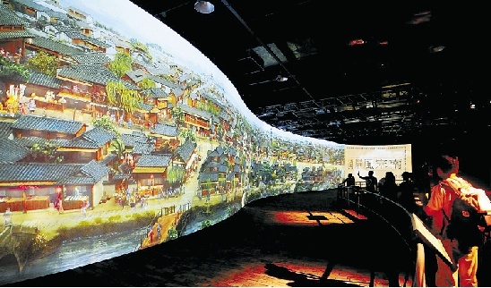 9月18日,2011杭州世界休闲博览会主题馆正式开馆,主题馆设在滨江白马湖生态创意城,展区内分设特色休闲展示馆、休闲主题形象馆、世界休闲风情馆、中国休闲风情馆和休闲生活体验馆五大区块。图为3D版的《南宋风情画》。 本报记者 李震宇 裘一佼 通讯员 里尔 摄