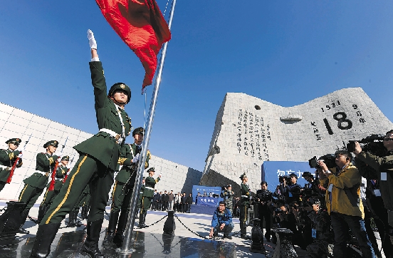 9月18日,在沈阳“九一八”历史博物馆的残历碑前举行升国旗仪式。 新华社记者 李钢摄