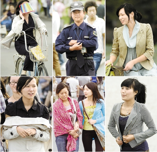 右图:昨天,杭州西湖景区保安顾师傅(上图中)上班时换上了长袖制服,他说:“今天断桥风大呵。”许多游客也都披上了外套。 本报记者 徐彦 摄