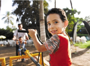 9月18日,在利比亚首都的黎波里的一座街心公园,一名儿童正在玩跷跷板。自利比亚执政当局武装进入的黎波里以来,当地社会秩序逐渐好转,部分商店已经开门营业。 新华社记者 李木子 摄