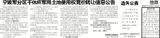 宁波军分区干休所军用土地使用权竞价转让信息公告