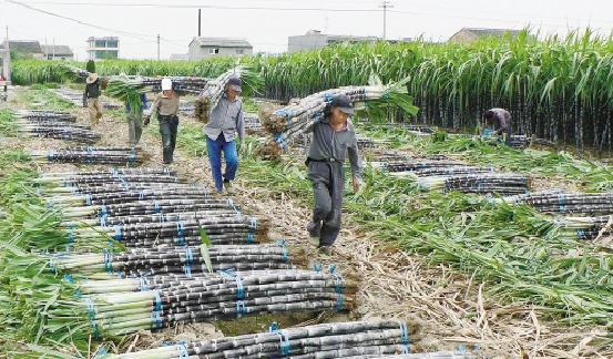 9月21日,温岭市箬横镇东桥头村甘蔗田里,农民工正忙着砍蔗、捆扎、搬运。今年种植的黑皮甘蔗皮薄质脆,清甜多汁。