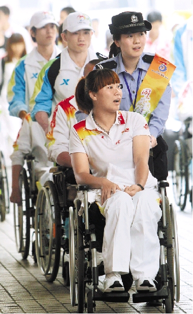 志愿者引导河北代表团运动员从杭州城站火车站出站。 记者 林云龙 摄