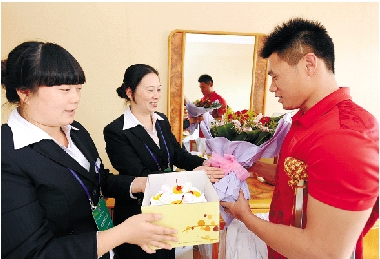 10月9日上午,刚刚抵达杭州的河北田径运动员崔彦峰,意外地收到华洋宾馆工作人员为他准备的生日蛋糕。 黄佳健 摄