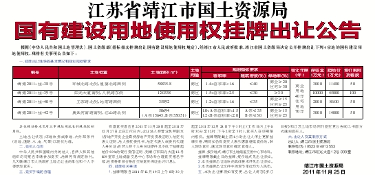 根据《中华人民共和国土地管理法》、国土资源部《招标拍卖挂牌出让国有建设用地使用权规定》,经靖江市人民政府批准,靖江市国土资源局决定公开挂牌出让下列4宗地的国有建设用地使用权,现将有关事项公告如下: