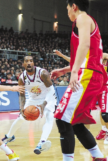 | 12月2日,浙江稠州银行队球员JR史密斯(左)在比赛中狂砍52分。当日,在CBA第六轮比赛中,浙江稠州银行男篮主场以113比91战胜八一双鹿队收获四连胜。坐镇主场的北京队迎战上赛季常规赛冠军新疆队,最终以99比97的比分战胜对手,豪取六连胜高居榜首。 陈熙春 潘良干 摄 |