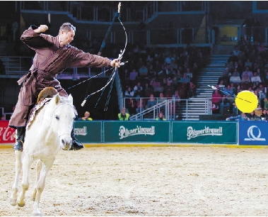 12月4日,在匈牙利首都布达佩斯,匈牙利人考绍伊在19.85秒钟之内射中14个抛起来的靶盘,打破自己两年前创造的20秒钟之内射中12个抛起来的靶盘的骑射吉尼斯世界纪录。图为考绍伊·拉约什相在骑射中。 新华社发