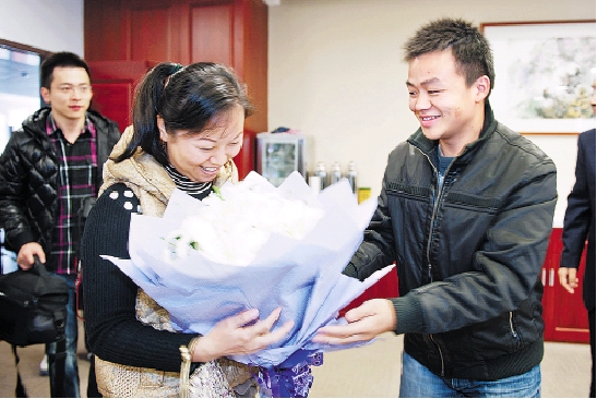 本报记者为吴菊萍献花。 本栏摄影:李震宇 李缪虹