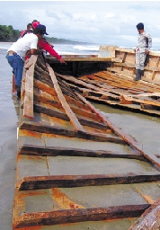 12月4日,在多米尼加纳瓜市海岸,救援人员查看打捞上来的偷渡船残骸。多米尼加警方4日说,一艘运载多米尼加非法移民的船只当天在该国北部纳瓜市附近海域沉没,造成至少3人死亡、30人失踪。据初步调查结果显示,偷渡船严重超载是导致这起事故的主要原因。