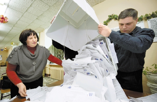 12月4日,在俄罗斯莫斯科一处国家杜马选举投票站,工作人员清点选票。 新华社发