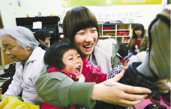 12月27日,杭州清波街道定安路社区彩虹制作社的“爱心大姐”将自己做的一双双“爱心棉鞋”,送给省听力语言康复中心的聋哑儿,让他们感受寒冬中的温暖。