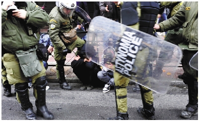 12月6日,在希腊首都雅典,防暴警察制服示威者。