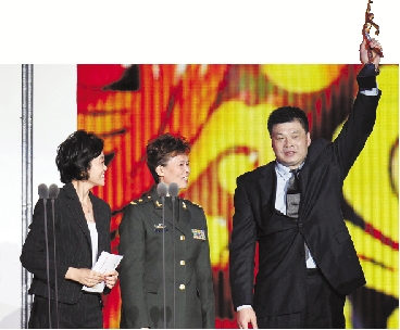 俞觉敏(右)代表获得年度最佳团队奖的中国女排领奖。 新华社发