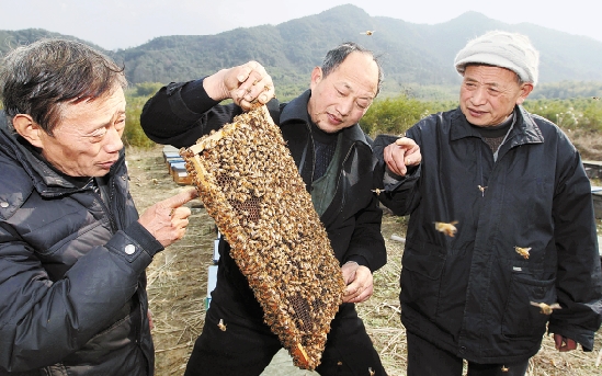 2月2日,绍兴县平水镇梅园村,县蜂业协会专家走进蜂园,现场对养蜂户进行技术指导。