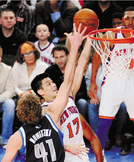 尼克斯队球员林书豪(右)在比赛中突破小牛队球员诺维茨基的防守上篮。 新华社发