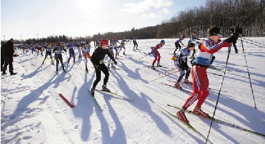 2月19日,第34届加蒂诺越野滑雪比赛在加拿大魁北克省加蒂诺公园进入第二天,共有2000多名运动员参加本次比赛。图为参加27.5公里和51公里自由式越野滑雪比赛的运动员起跑。 新华社发