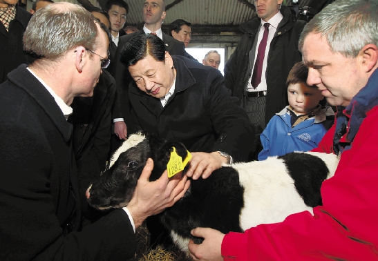 2月19日,正在爱尔兰访问的国家副主席习近平在爱尔兰农业部长科文尼(左一)陪同下参观考察爱尔兰詹姆斯·林奇农场。这是习近平在牛圈抚摸前一天刚刚生下的小牛犊。 新华社记者 兰红光 摄