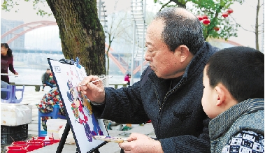 3月18日,建德市新安江城区的吴大伯来到江滨公园,一会儿工夫就将唐老鸭与米老鼠画出来了,他的卡通引来了小朋友的围观。 宁文武 摄