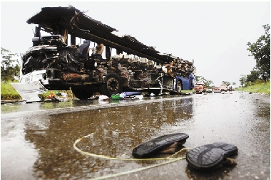 这是3月17日拍摄的巴西米纳斯吉拉斯州重大交通事故现场。当日,巴西东南部米纳斯吉拉斯州费力珊迪亚市发生一起重大交通事故,一辆大巴与卡车相撞,造成至少16人死亡。 新华社发
