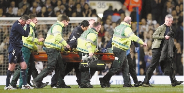 博尔顿中场球员法布里斯·姆安巴被医疗人员用担架抬走。 新华社发