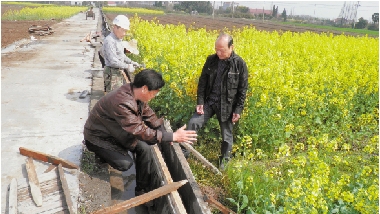 昨天一早,兰溪市种粮大户严柏清来到自家承包田,与工程建设人员一道,就农机下田建好下田道、不损害水渠等问题进行现场商讨。 记者 徐宪忠 摄