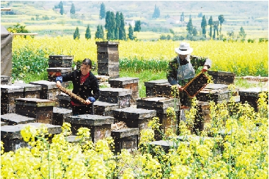 3月31日,建德市大慈岩镇新叶村蜂农叶献斌夫妇俩正忙于在田间放养春季蜂群。叶献斌每年春季都将带着160多箱蜂群前往苏、冀、吉等六个省放养,一天最多能采蜂蜜300多公斤。 宁文武 摄