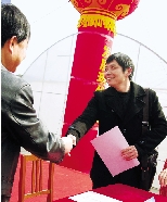 种粮大户傅献军(右)与粮食收储公司签订早稻订单合同。
