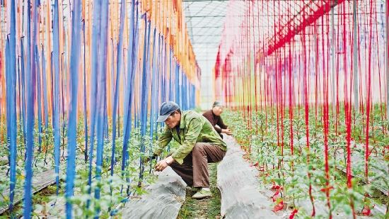 3月31日,义乌市秀禾农业公司员工在大棚內给从以色列引种的小番茄整枝。义乌市大力发展设施农业,目前全市已发展农用钢架大棚200多万平方米。