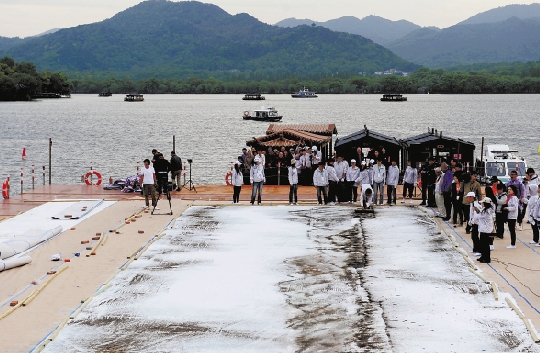 4月18日,蔡国强用火药炸出雷峰塔一带山脉景色,一幅水墨画呈现出来。 本报记者 梁臻 摄